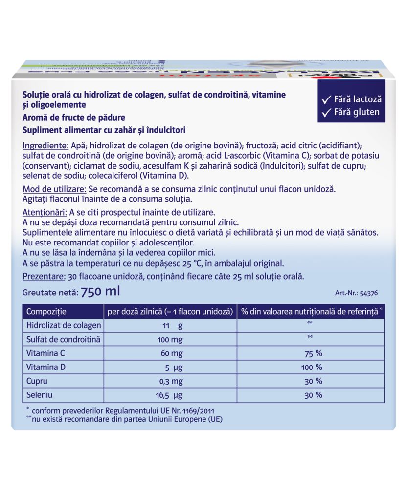 Un flacon unidoza cu 25 ml solutie orala contine: Apa, hidrolizat de colagen (de origine bovina) 44%, fructoza (indulcitor), acid citric (corector de aciditate), sulfat de condroitina (de origine bovina) 0,4%, acid L-ascorbic (Vitamina C), sorbat de potasiu (conservant), aroma, ciclamat de sodiu, acesulfam de potasiu si zaharina sodica (indulcitori), sulfat de cupru, selenat de sodiu, colecalciferol (Vitamina D).