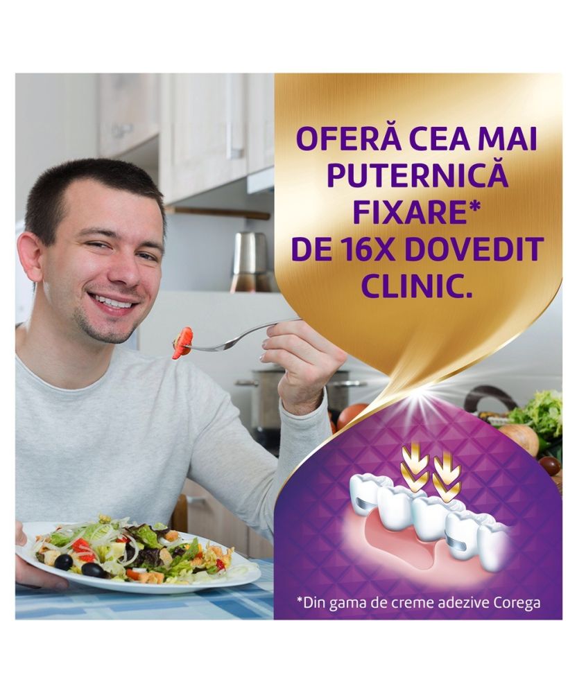 Este o crema adeziva care asigura acoperirea superioara* a suprafetei protezei dentare si fixarea ferma a acesteia. Noul aplicator este special conceput pentru o aplicare mai precisa a cremei adezive. Corega Max Sigilare este potrivita pentru toti purtatorii de proteze dentare totale sau partiale care nu doresc sa isi faca griji cu privire la patrunderea resturilor alimentare sub proteza dentara. Crema adeziva Corega Max Sigilare este conceputa pentru a sigila spatiul dintre proteza dentara si gingie, ajutand astfel la prevenirea patrunderii resturilor alimentare iritante sub proteza si ofera, in acelasi timp, o fixare solida si de durata a protezei dentare.