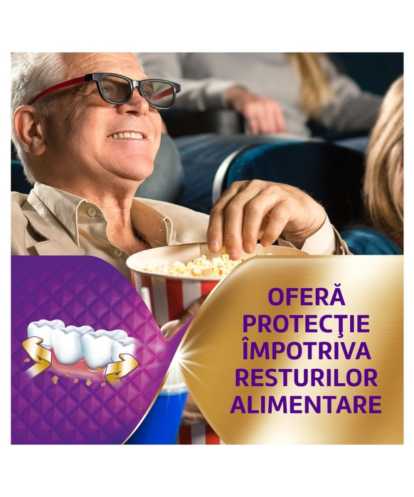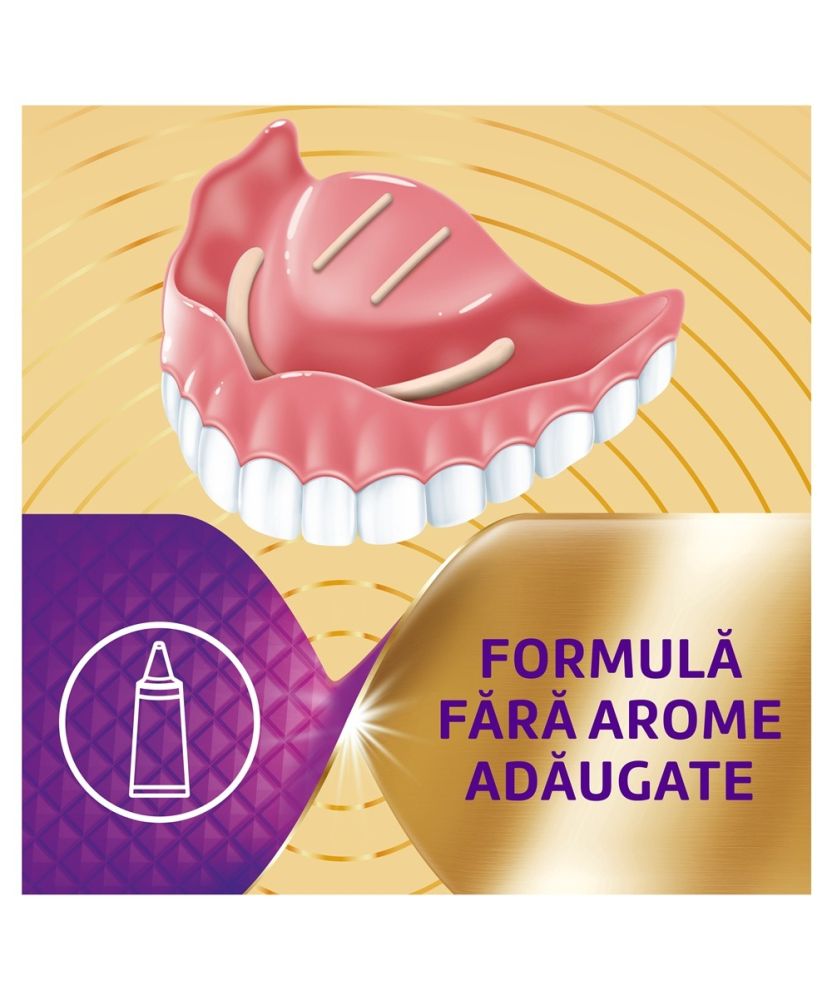 Produsul contine doi polimeri adezivi care isi maresc volumul in prezenta umiditatii. Astfel, se creeaza o structura etansa 3D intre proteza dentara si tesutul gingival. De asemenea, ajuta la impiedicarea patrunderii resturilor alimentare iritante sub proteza dentara.
