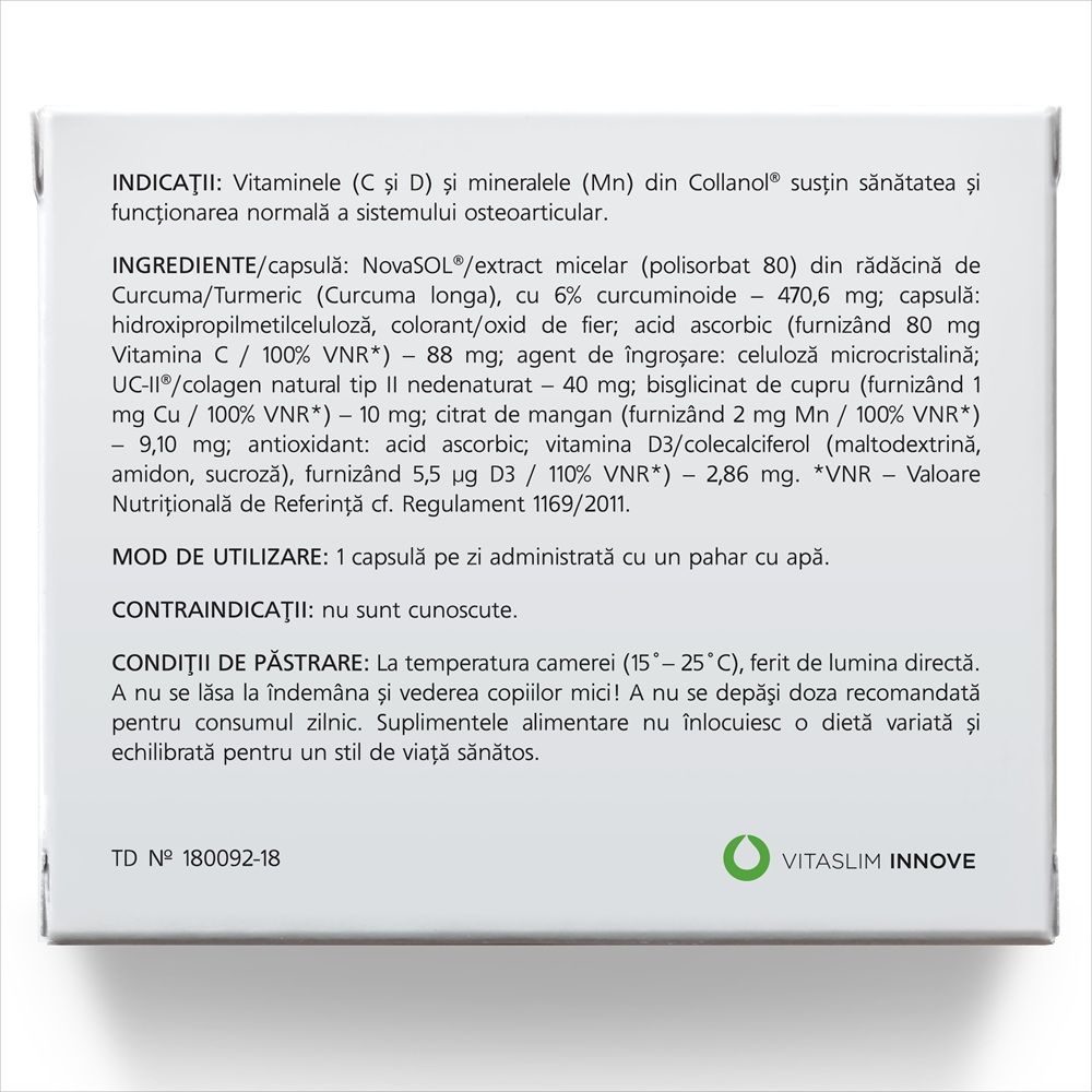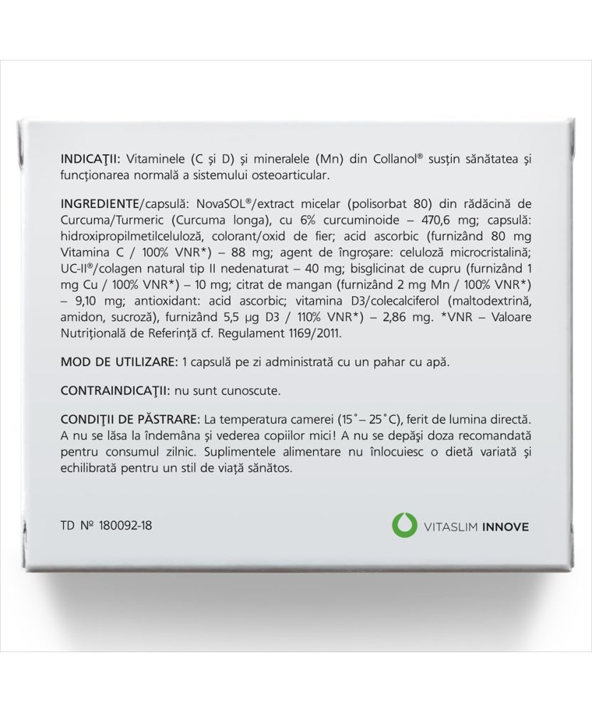 Collanol este un supliment alimentar inovator, conceput special pentru persoanele care doresc să își mențină mobilitatea și sănătatea sistemului osteoarticular. Datorită tehnologiei avansate și ingredientelor premium, precum colagenul nedenaturat UC-II® și extractul micelar de curcuma NovaSOL®, Collanol oferă o absorbție superioară și o eficiență sporită.